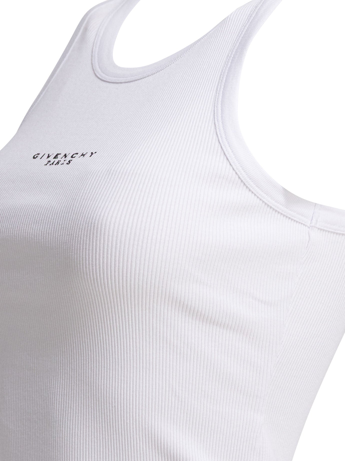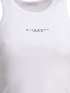 Elevate your everyday essentials with this sleek white cotton elastane top from Givenchy. Crafted from a premium ribbed knit blend, this form-fitting tank features the iconic Givenchy Paris logo at the chest, adding a touch of luxury to your casual wardrobe.