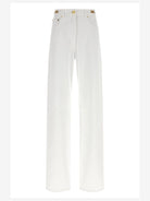 White cotton denim jeans in a softened wash. They feature belt loops, a front Medusa button closure and zip, applied Medusa details at the waist, five pockets, a leather patch with logo on the back waist, high rise, and wide legs. Regular fit.
