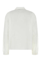 This elegant white cotton shirt from Prada embodies timeless sophistication with contemporary flair. Featuring classic long sleeves and a crisp shirt collar, this versatile piece showcases subtle decorative stitching that adds refined detail to the clean silhouette.