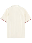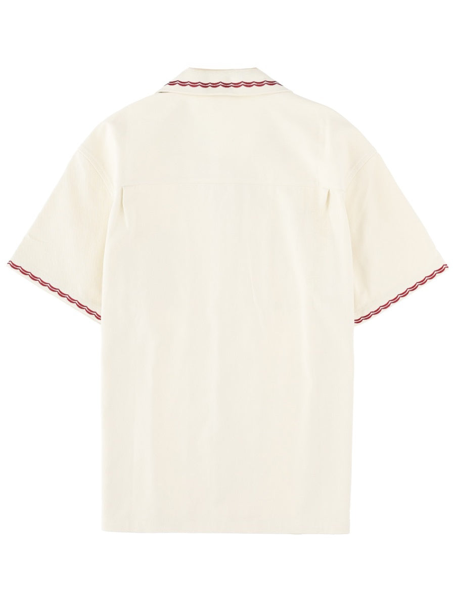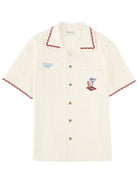 Elevate your casual wardrobe with this distinctive white cotton shirt from DRÔLE DE MONSIEUR. Crafted from 100% cotton, this short-sleeve button-up features eye-catching embroidered patches and contrasting burgundy piping along the collar and sleeves for a unique, retro-inspired aesthetic. The relaxed camp collar silhouette and decorative details make it perfect for vacation styling or elevated off-duty looks. Pair it with tailored shorts for a sophisticated summer ensemble, or wear it with denim for effortless weekend style. This statement piece seamlessly blends French design sensibility with laid-back comfort.