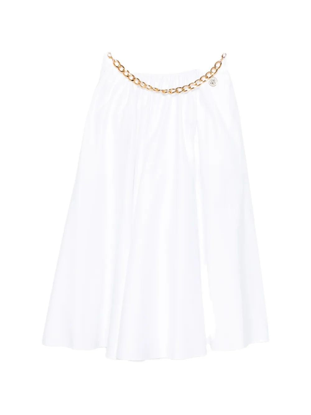 The signature gold chain detail at the waistband adds a touch of luxury and sophistication, making this piece instantly recognizable as an Elisabetta Franchi design. The crisp white hue and versatile midi length make it perfect for endless styling possibilities.