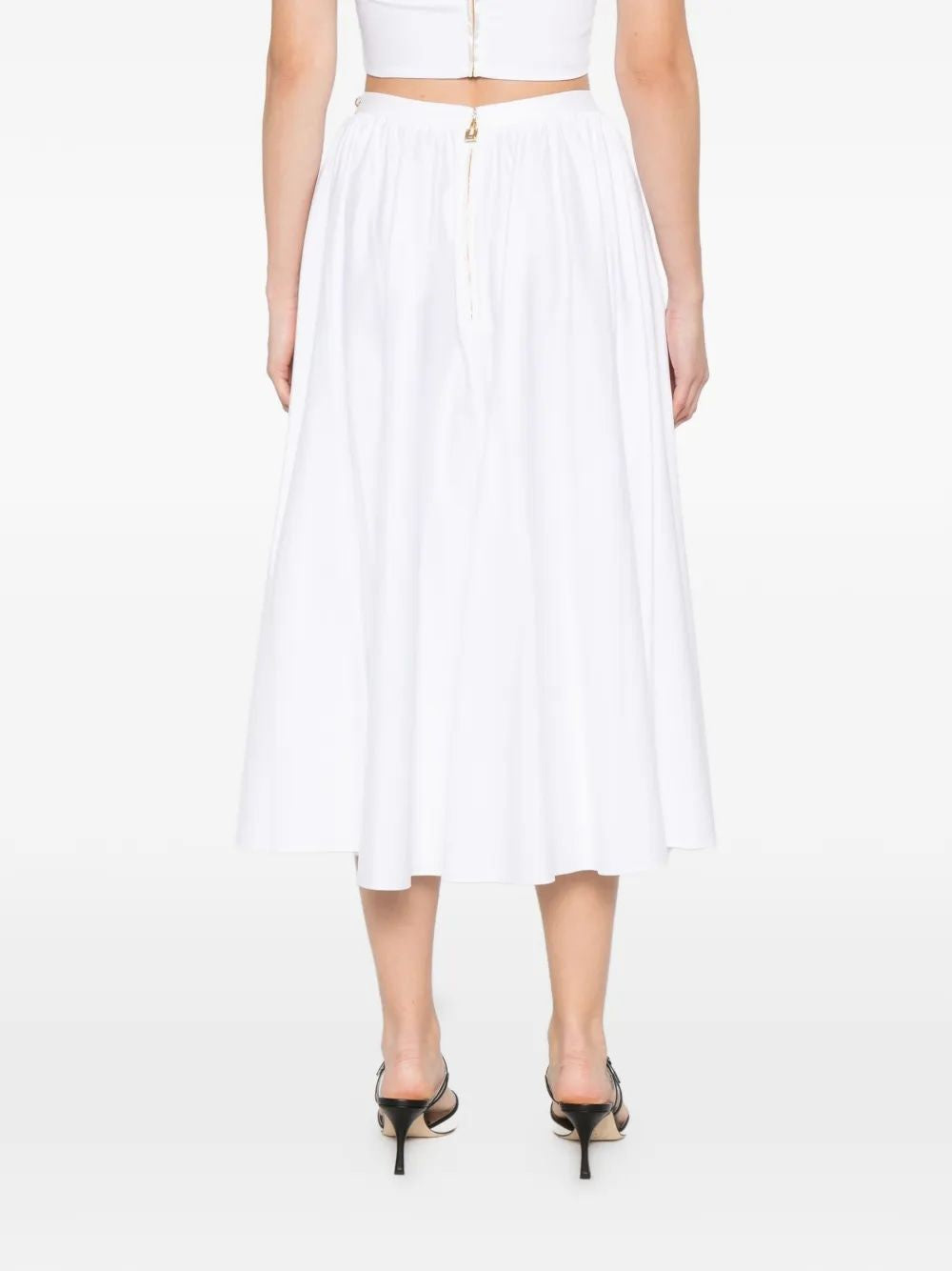 Elevate your warm-weather wardrobe with this stunning white cotton skirt from Elisabetta Franchi. Crafted from lightweight, breathable cotton fabric, this pleated midi skirt features an elegant flowing silhouette that moves beautifully with every step.
