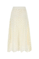 Embrace effortless elegance with this stunning white crochet skirt from FARM Rio. Featuring intricate floral crochet detailing in an off-white hue, this midi-length A-line skirt brings bohemian charm to your wardrobe.