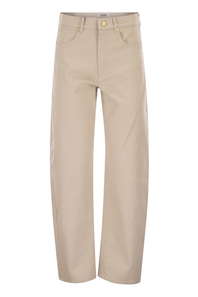 MAX MARA`S EMILY WHITE COTTON PANTS. 5-POCKET PANTS CRAFTED FROM WHITE STRETCH COTTON BULL DENIM, FEATURING A MID-WAIST, BELT LOOPS, FRONT BUTTON AND FLY-ZIP FASTENING, GOLD-TONED METAL RIVETS, AND A BARREL LEG.