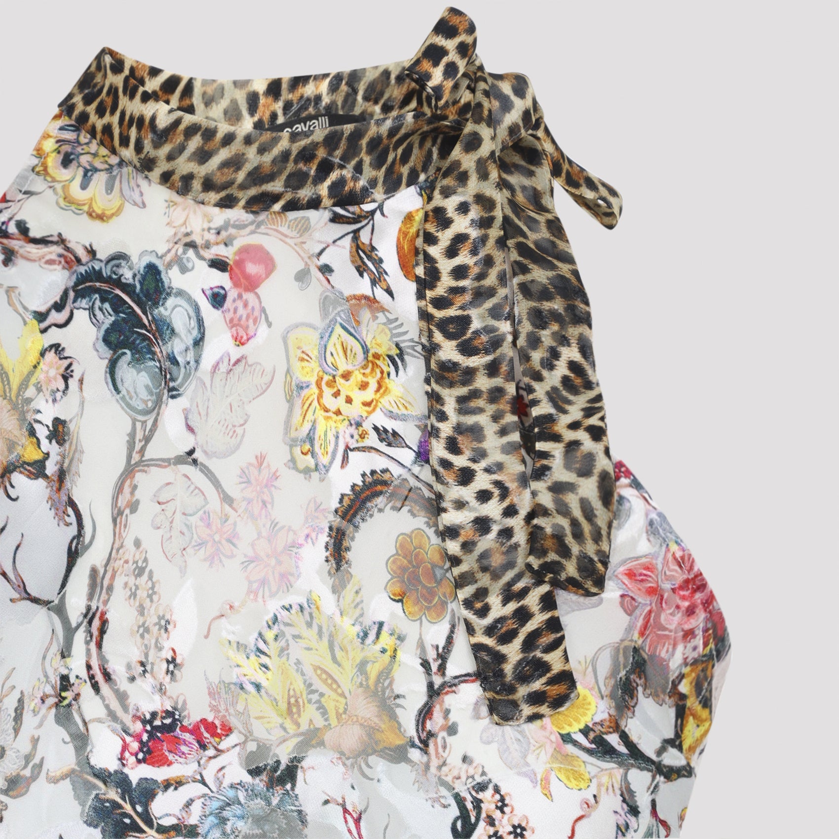The sophisticated halter neckline is adorned with an animalier silk self-tie collar, adding a touch of Roberto Cavalli's iconic wild glamour. The slightly flared hem creates a flattering silhouette that moves beautifully with you.