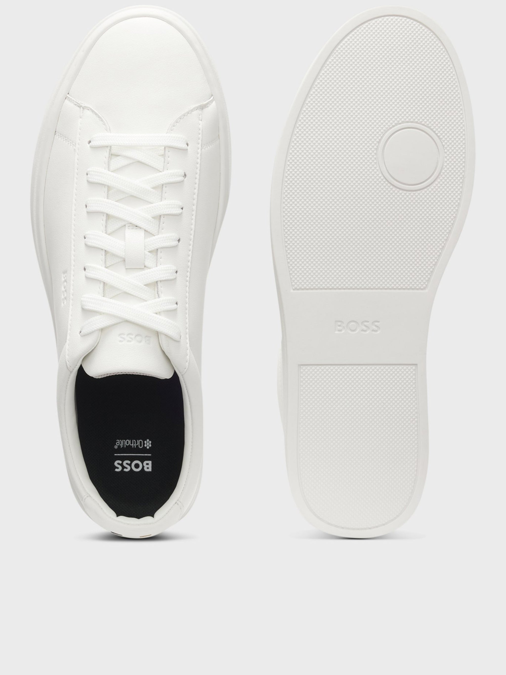 Elevate your everyday style with these pristine white leather logo sneakers from HUGO BOSS. Crafted from premium leather, these low-top lace-up sneakers feature a subtle embossed logo detail and a durable rubber sole for all-day comfort.