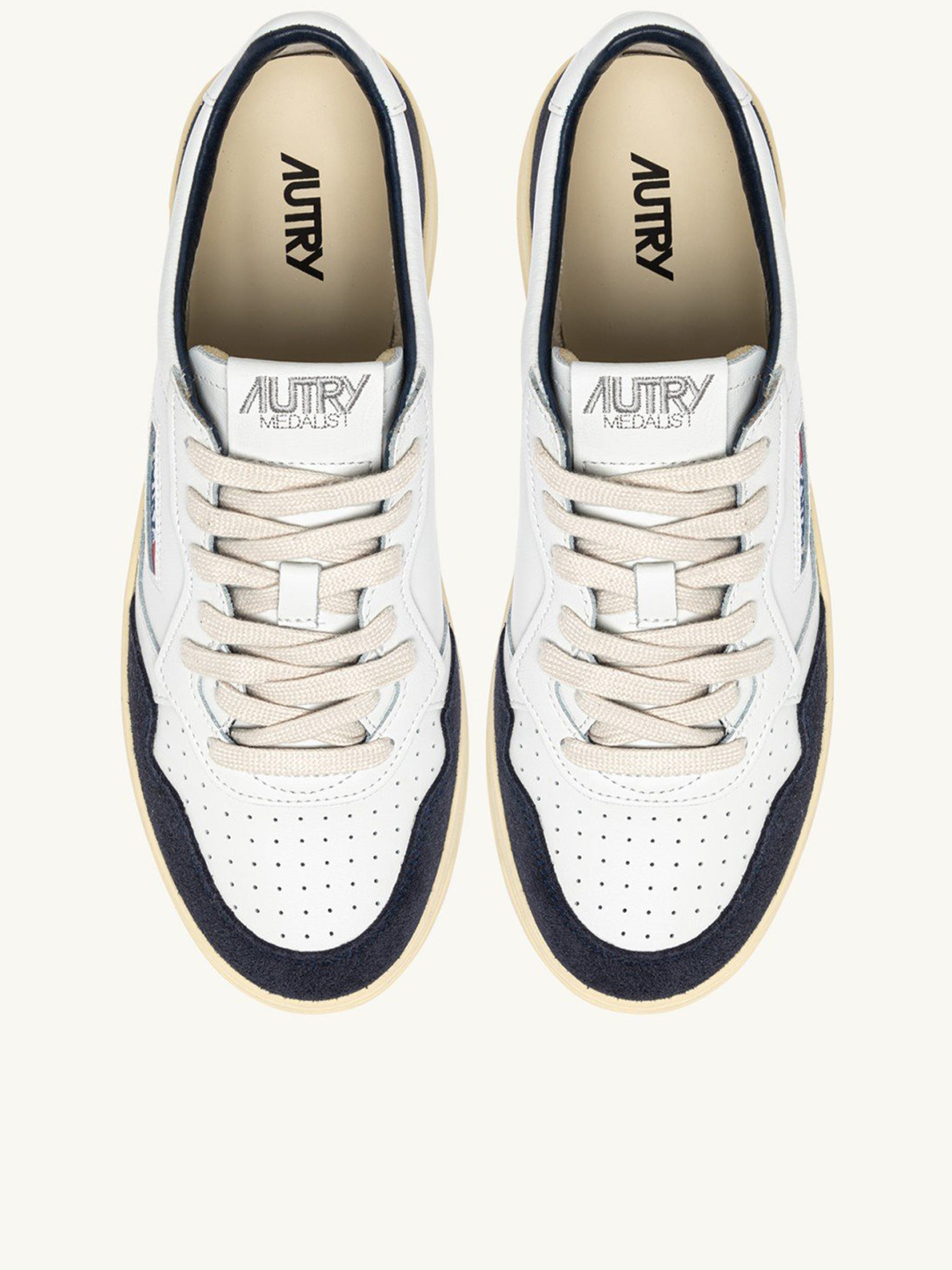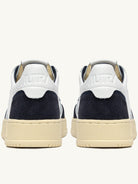 Elevate your sneaker game with the Autry Medalist Low in pristine white leather. This iconic court-style sneaker features a premium leather upper complemented by rich navy blue suede accents on the toe and heel, creating a sophisticated contrast that stands out.