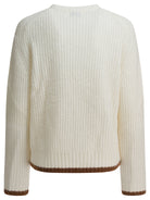 The timeless cream hue is beautifully accented with contrasting brown trim at the cuffs and hem, adding a refined touch to this versatile piece. The crew neckline and long sleeves create a flattering silhouette that pairs effortlessly with everything from tailored trousers to your favorite denim.