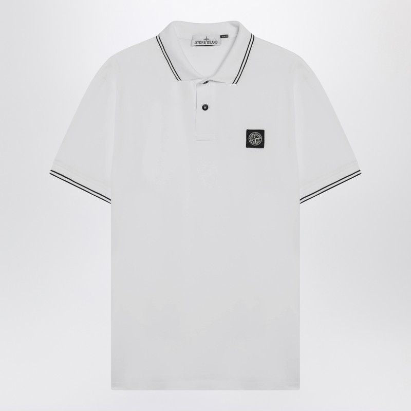 This classic white polo shirt from Stone Island is crafted from premium stretch cotton piqué for exceptional comfort and breathability. The clean design features contrasting trims that add a refined sporty edge, while the iconic compass logo patch on the chest provides signature brand recognition.