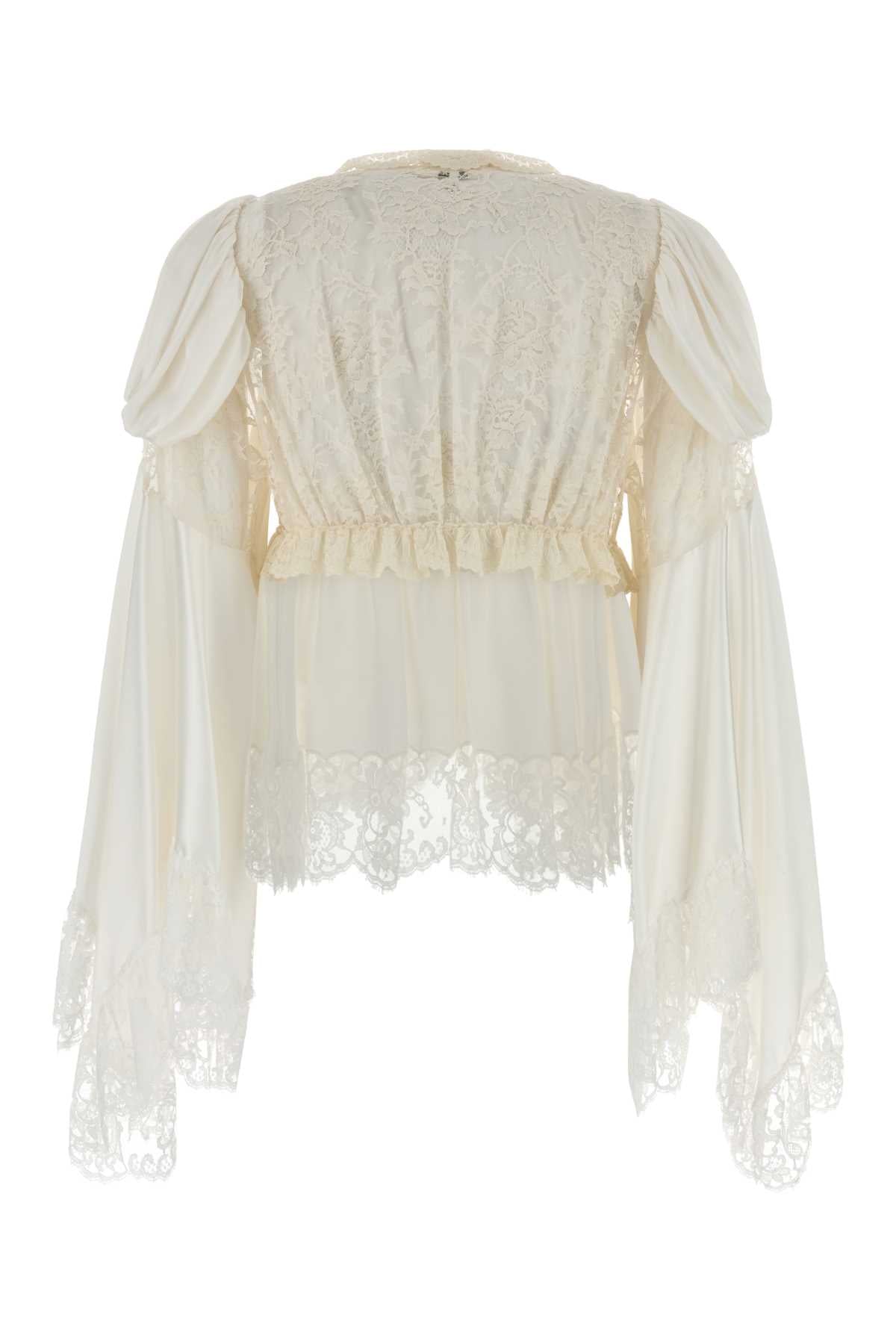 Embrace romantic elegance with this exquisite white satin blouse from Chloé. This ethereal piece features delicate lace detailing throughout, creating a beautifully feminine silhouette that's both sophisticated and whimsical.