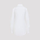 JEAN PAUL GAULTIER SCANNED BRA WHITE COTTON SHIRT. CRAFTED FROM WHITE STRETCH COTTON, FEATURING A POINTED COLLAR, FRONT BUTTON FASTENING, A BLUE BRA STAMPED ON THE CHEST, LONG SLEEVES WITH BUTTONED CUFFS, A BACK YOKE, AND A ROUND HEM.
