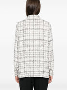 WHITE/BLACK TWEED BOUCLÉ CONSTRUCTION FRONT BUTTON FASTENING PLAID CHECK PATTERN STRAIGHT-POINT COLLAR LONG SLEEVES BUTTONED CUFFS TWO CHEST PATCH POCKETS SIDE SLITS HIGH-LOW HEM