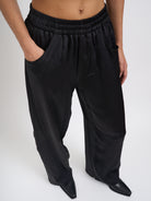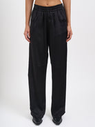 The drawstring waist ensures a customizable fit, while functional side and back pockets add practical appeal. Perfect for both casual days and elevated off-duty looks, these versatile trousers can be styled with everything from sleek bodysuits and heels to oversized sweaters and sneakers.