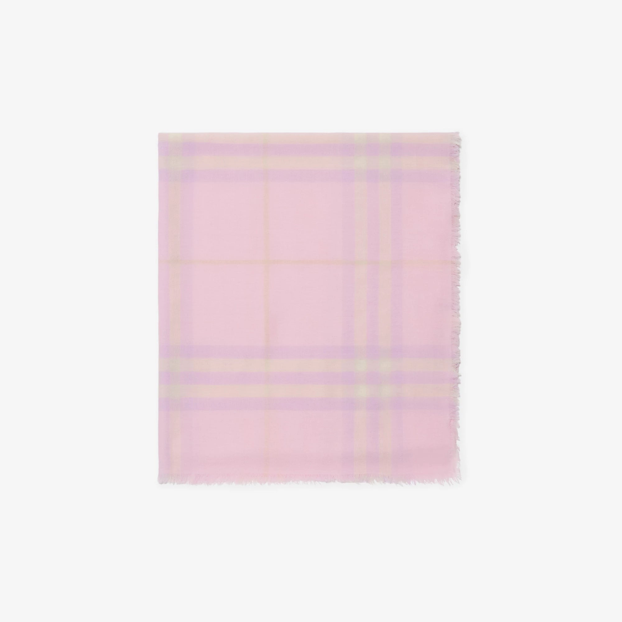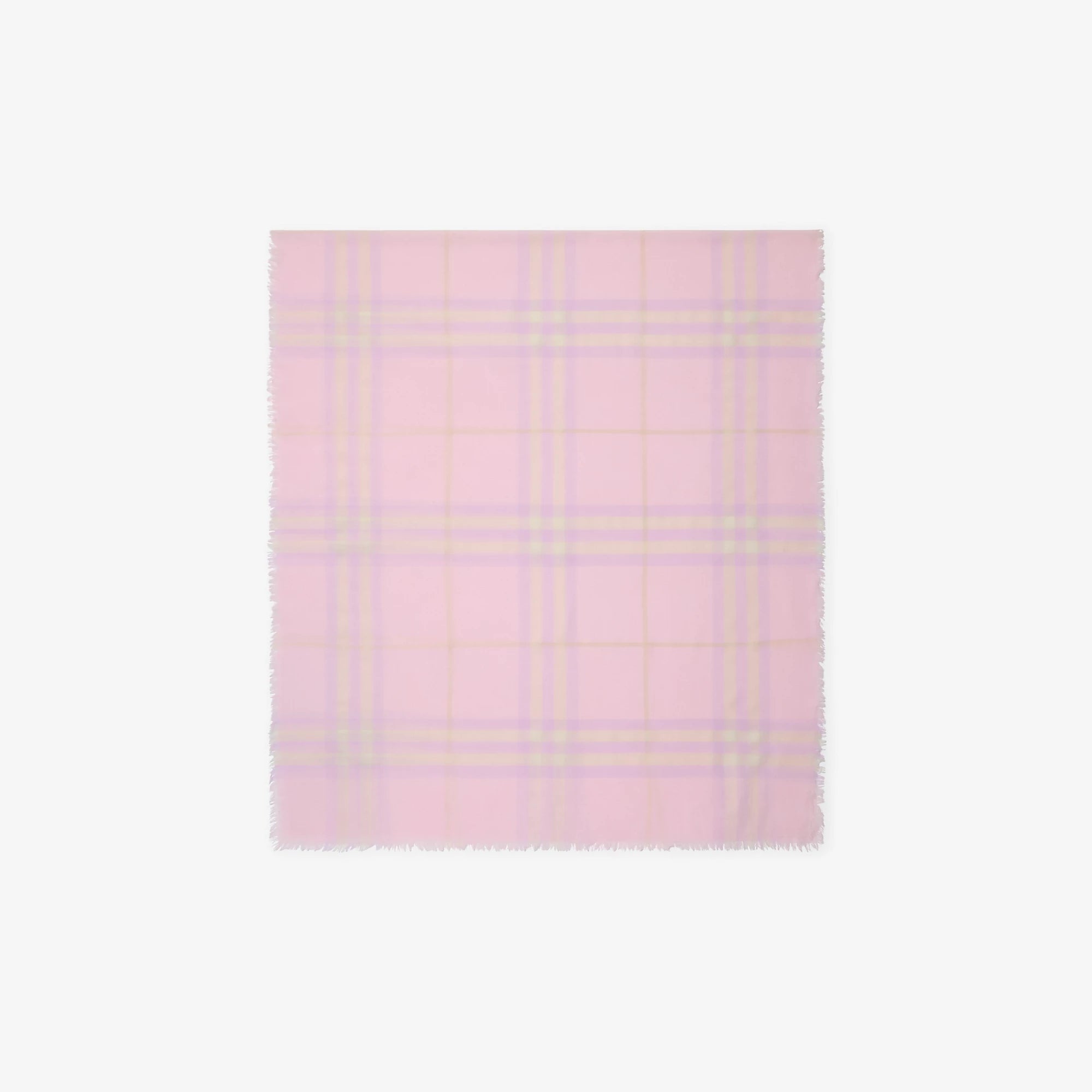 Elevate your accessory collection with this luxurious wide wool scarf from Burberry, featuring their iconic check pattern in a soft, feminine colorway.