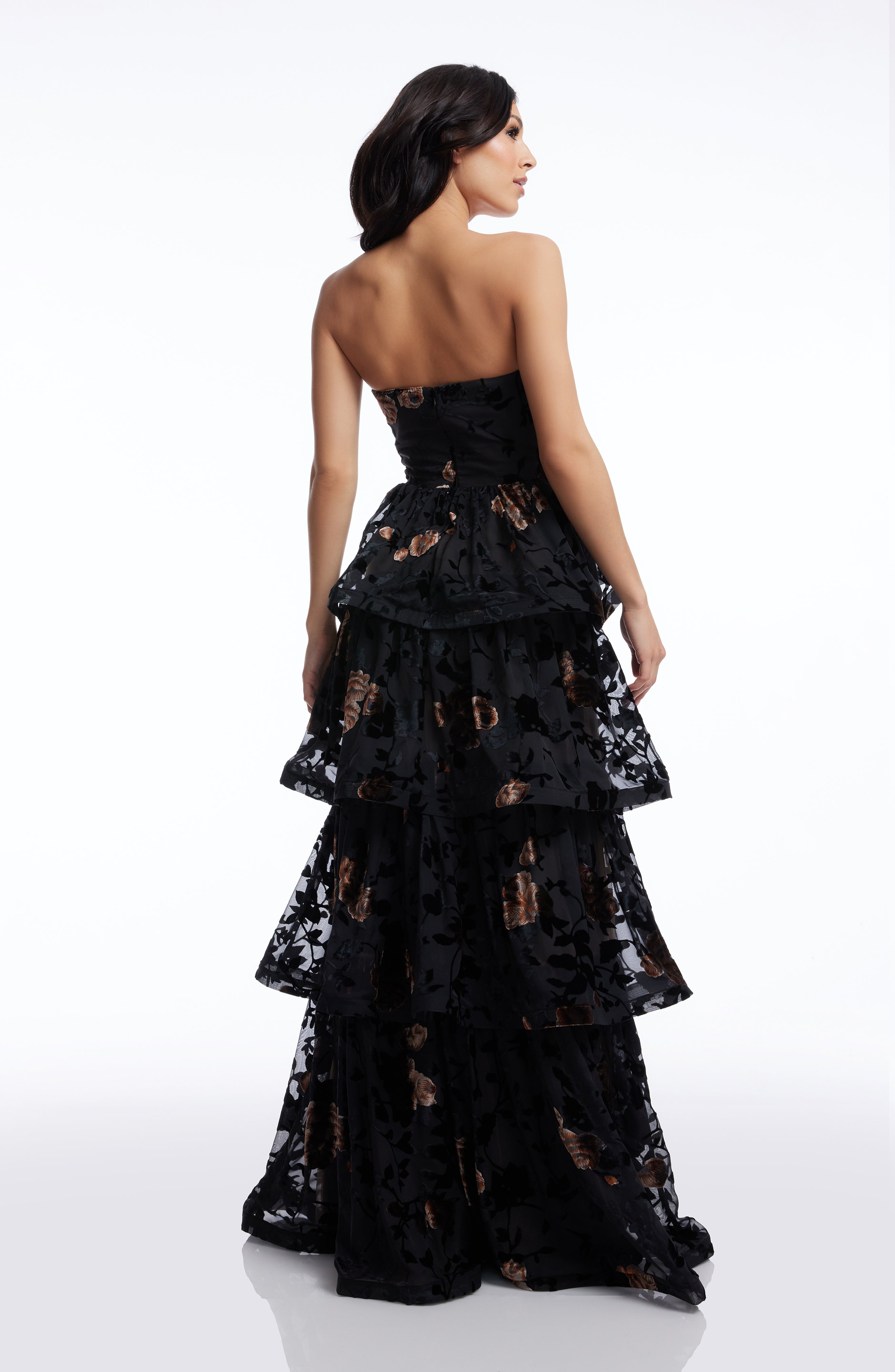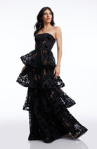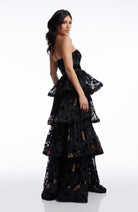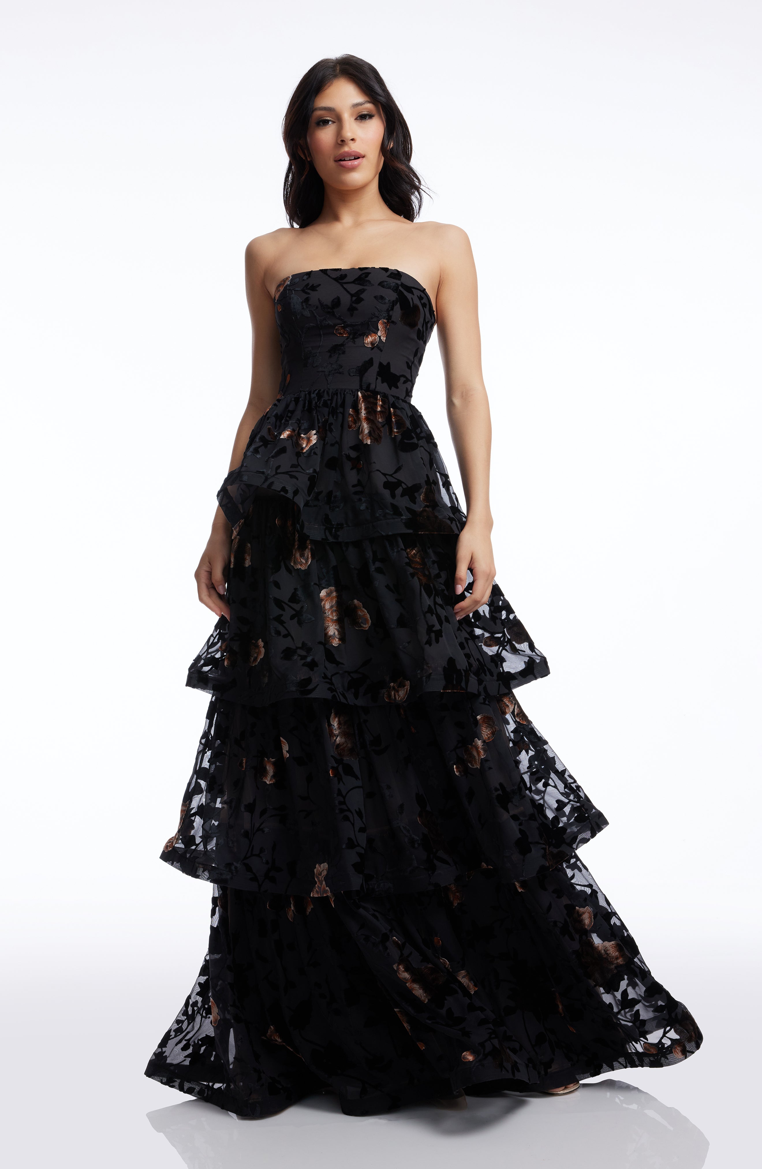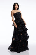 The Willa Dress is a stunning A-line gown featuring a tiered full-length skirt that adds movement and grace to your look. Designed with a strapless neckline, this dress offers a timeless silhouette that's both elegant and sophisticated.