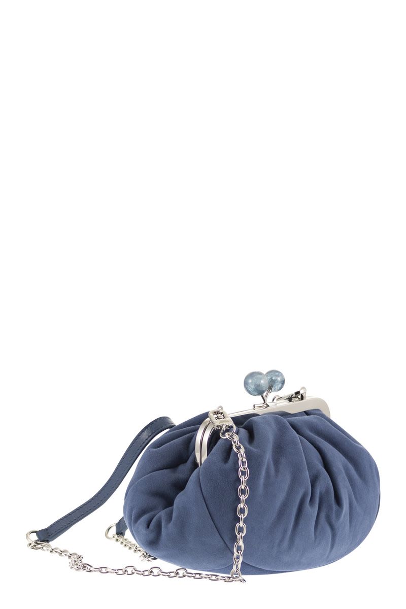 This exquisite Pasticcino bag features soft suede leather construction with a sophisticated metal closure adorned with customized marbled effect beads. The versatile design includes a removable chain shoulder strap with a leather shoulder pad, allowing you to carry it as a clutch or wear it crossbody for hands-free convenience.