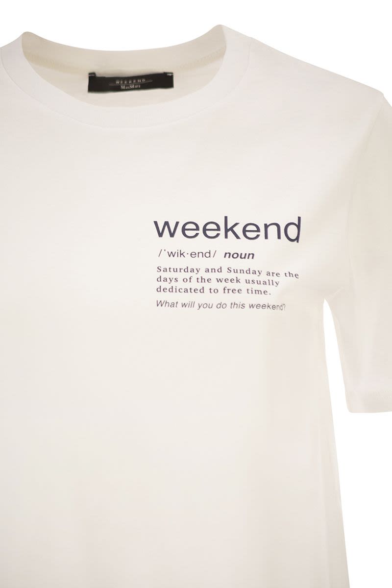 Embrace effortless style with this jersey t-shirt from Weekend Max Mara. Crafted in pure cotton jersey, this basic tee features a charming printed "weekend" motif on the front that perfectly captures a relaxed, carefree spirit.