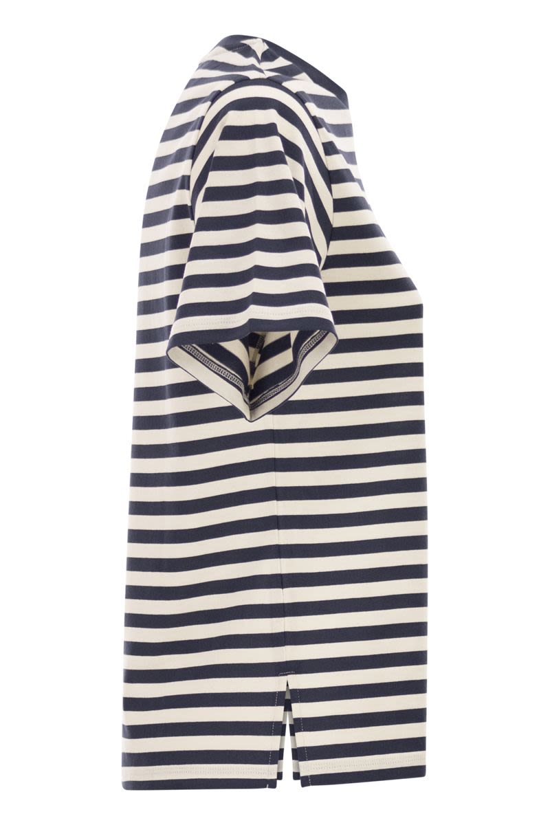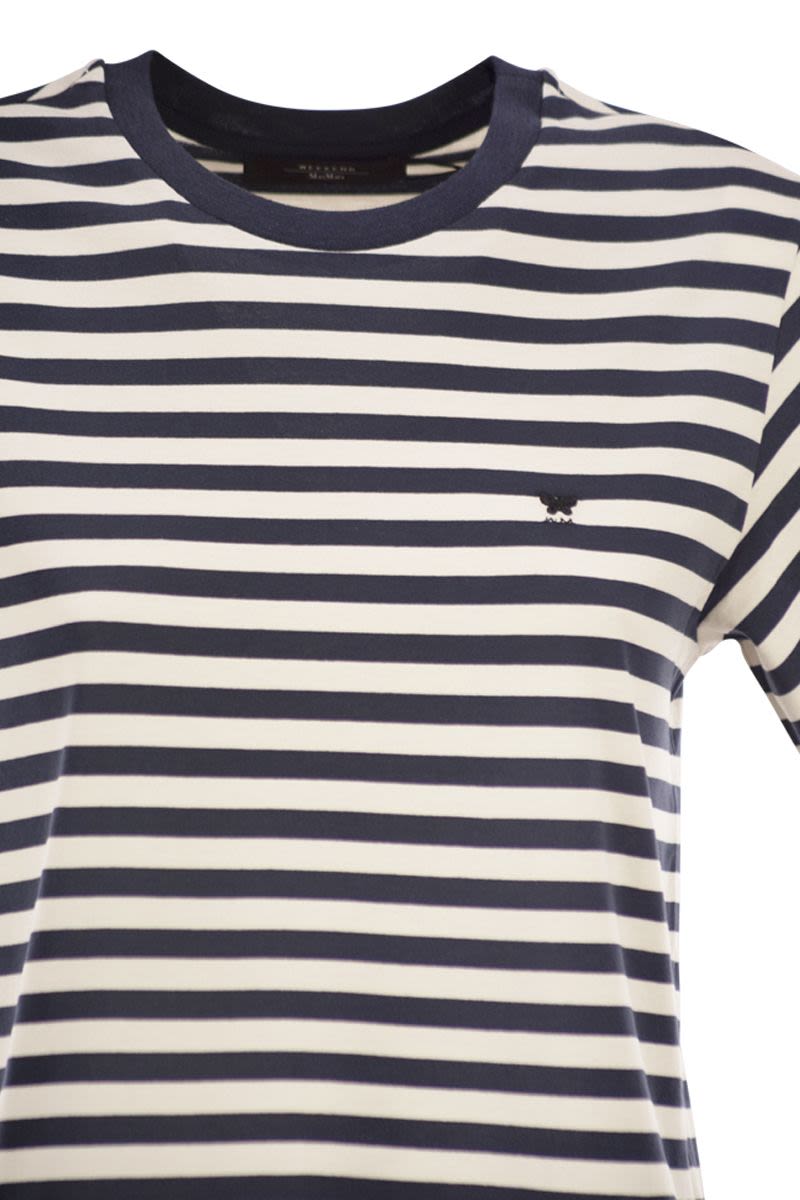 Elevate your everyday wardrobe with this effortlessly chic straight jersey t-shirt from WEEKEND MAX MARA. Crafted in pure cotton jersey, this classic piece features timeless navy and white stripes that never go out of style.