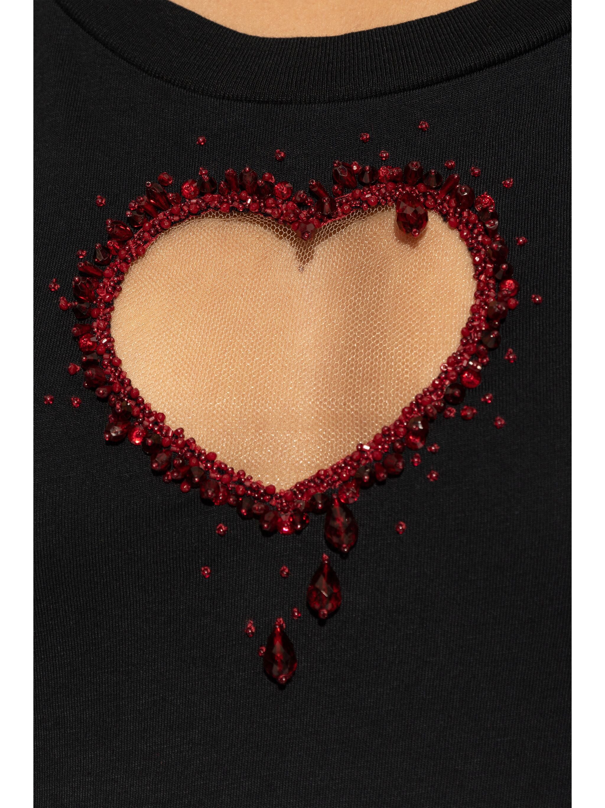 Featuring a flattering crew neckline and 3/4 sleeves, this mini dress showcases a distinctive heart motif with red detailing that adds a playful yet sophisticated touch.