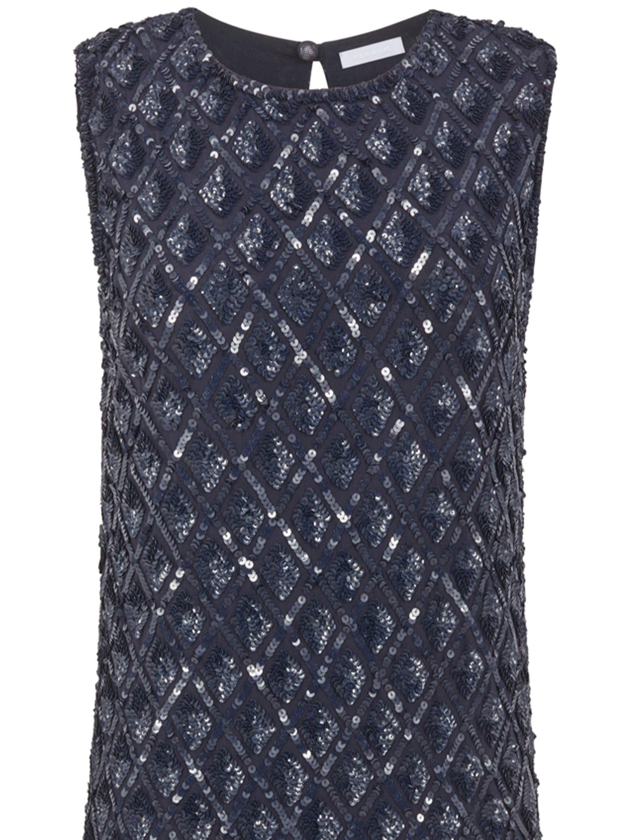 Featuring an intricate diamond lattice pattern of shimmering embellishments, this sleeveless shift dress creates a sophisticated and glamorous silhouette.