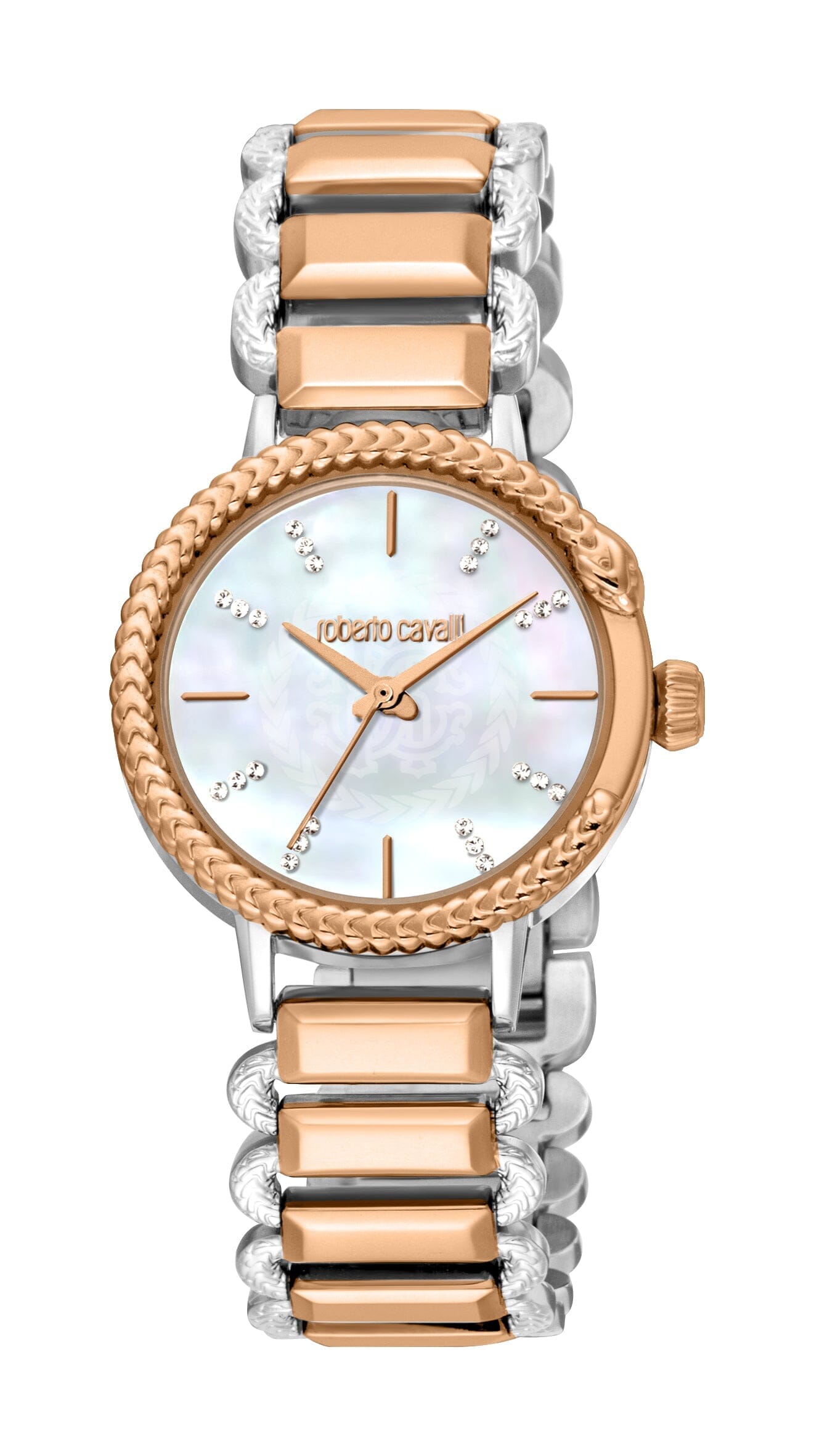 Women's Roberto Cavalli Snake Core White MOP Two Tone Silver & Rose Gold Quartz Watch