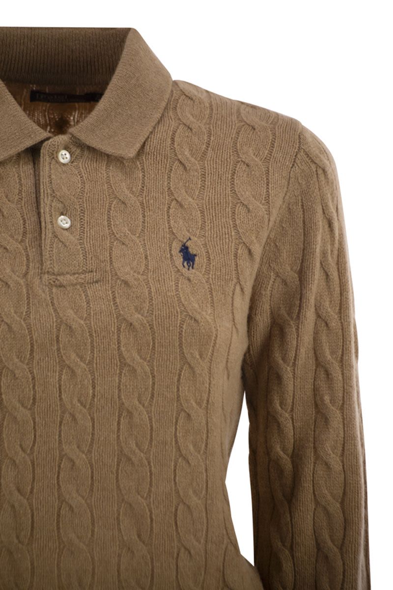 MADE FROM WOOL AND CASHMERE, THIS VERSION OF THE POLO SHIRT COMBINES RALPH LAUREN'S SIGNATURE CABLE KNIT WITH A SLIM SILHOUETTE. - SLIM FIT, SLIGHTLY FITTED CUT - HIP LENGTH - RIBBED POLO COLLAR - TWO-BUTTON CLOSURE - LONG SLEEVES WITH RIBBED CUFFS - RIBBED HEM - EXCLUSIVE EMBROIDERED PONY ON THE LEFT CHEST DESIGNER ID: 211972132 002