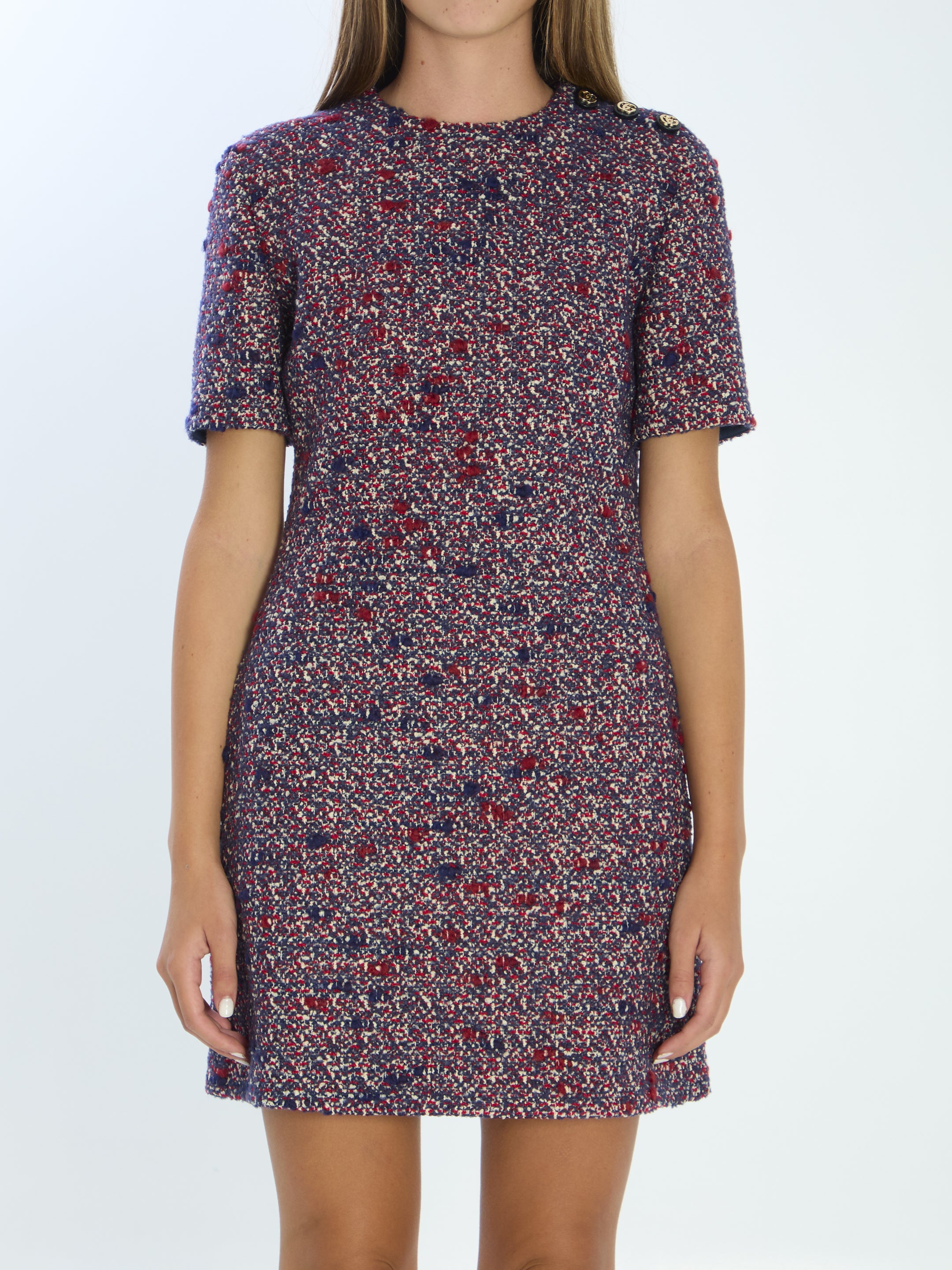 Short dress in wool and polyamide bouclé in blue, red, and white tones. Features a crew neckline, short sleeves, three signature buttons on the shoulder, two side slit pockets, and an invisible zip closure at the back. Regular fit.