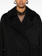 BLACK CAMEL HAIR BRUSHED EFFECT CONCEALED FRONT DOUBLE-BREASTED BUTTON FASTENING WIDE NOTCH LAPELS CRYSTAL EMBELLISHMENT LONG SLEEVES TWO SIDE INSET POCKETS LOGO-JACQUARD LINING STRAIGHT HEM