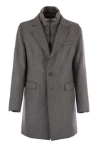 COAT MADE OF WOOL DESIGNED TO ACHIEVE A MéLANGE EFFECT WITH A CONTINUOUS THREAD. HERNO REINTERPRETS THE CLASSIC TAILORED SILHOUETTE WITH A TECHNICAL TEXTURE AND LUXURIOUS FEEL, AND THE BIB IS PERFECT FOR MAXIMUM PRACTICALITY DURING THE MID-SEASON. - REGULAR FIT - QUILTED PADDING - BIB - CLASSIC LAPEL - SLIT POCKET - FLAP POCKETS - SINGLE-BREASTED BUTTON CLOSURE DESIGNER ID: CA000202U33432R 9420