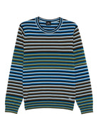 Elevate your casual wardrobe with this Wool Crewneck Sweater from PS Paul Smith. Featuring vibrant blue and green horizontal stripes, this long-sleeve pullover brings a playful yet sophisticated touch to any outfit. The classic crew neckline and ribbed hem and cuffs ensure a comfortable, polished fit that works effortlessly from weekend outings to relaxed office days. Crafted from premium wool, this sweater offers warmth and durability while maintaining a refined aesthetic. Style it with dark denim and sneakers for an effortlessly cool look, or layer it under a blazer for smart-casual appeal.