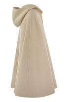 EMBLEMATIC CAPE PROTAGONIST OF THE COLLECTION MADE OF FINE VIRGIN WOOL. IT RECALLS A SOPHISTICATED ELEGANCE IN FULL FABIANA FILIPPI STYLE, UNDERLINED BY THE LOOSE FIT, HOOD, BUTTON FASTENING AND ARM OPENING. - FRONT BUTTON FASTENING - ARM OPENING - FLUSH SIDE POCKETS - HOOD DESIGNER ID: CTD214F274D752 0145