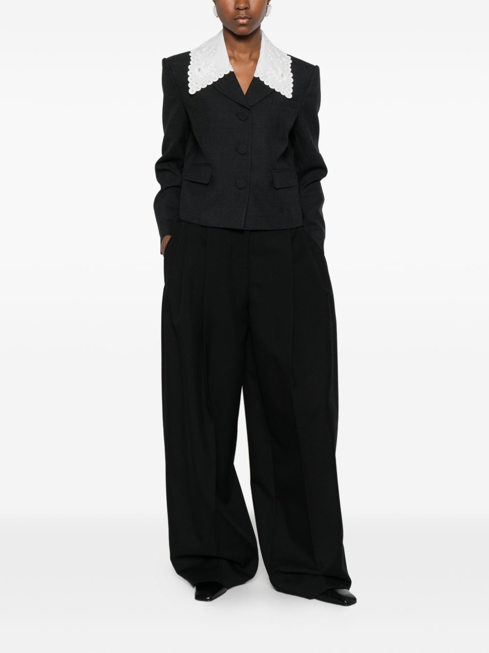 Elevate your outerwear collection with this sophisticated wool jacket from Self-Portrait. Crafted from a luxurious blend of silk and nylon, this black jacket features a striking white scalloped collar that adds a touch of vintage-inspired elegance to the structured silhouette.
