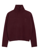 This luxurious AMI Paris wool knitwear pullover features a sophisticated turtleneck design in a rich burgundy hue.
