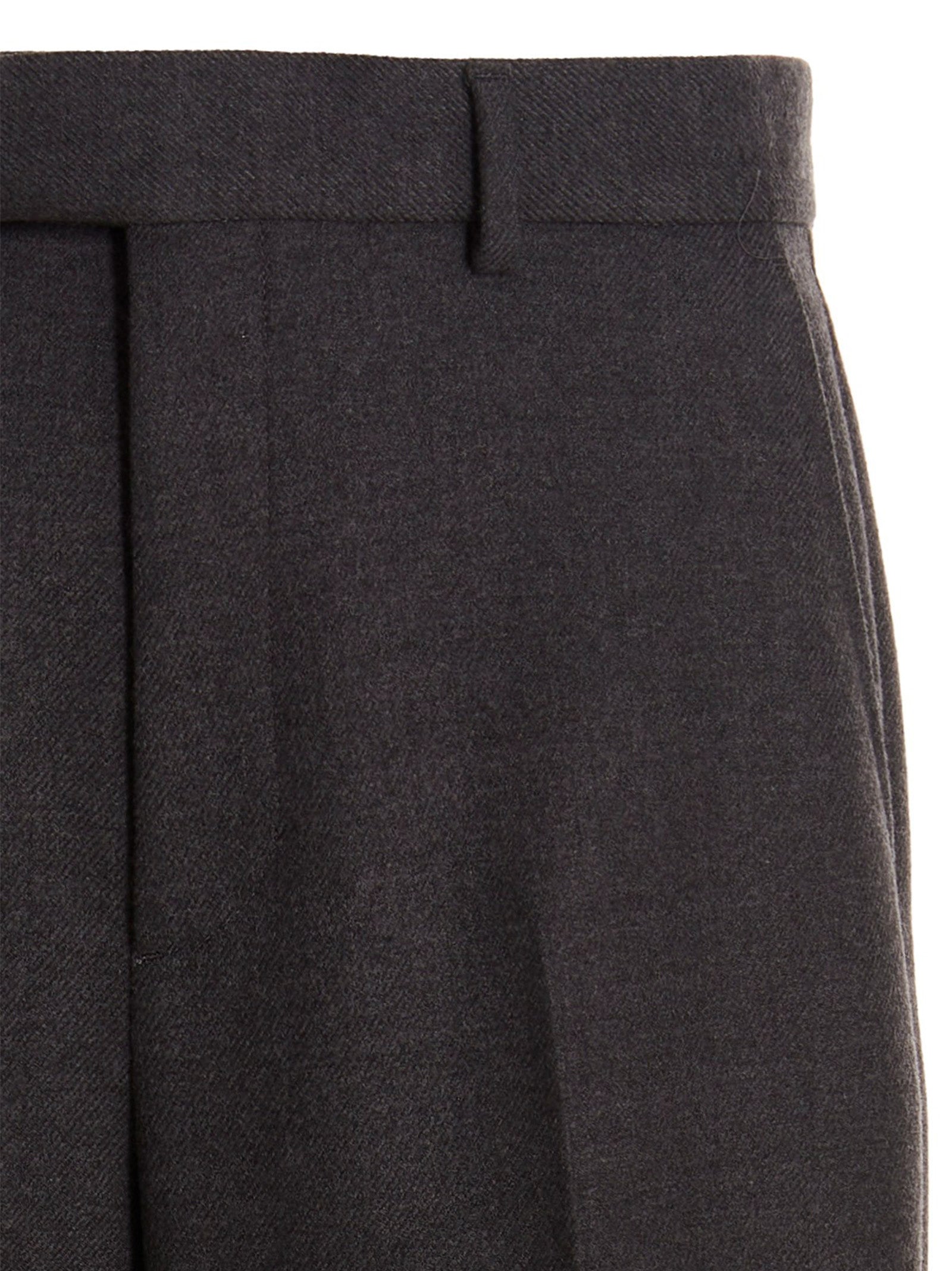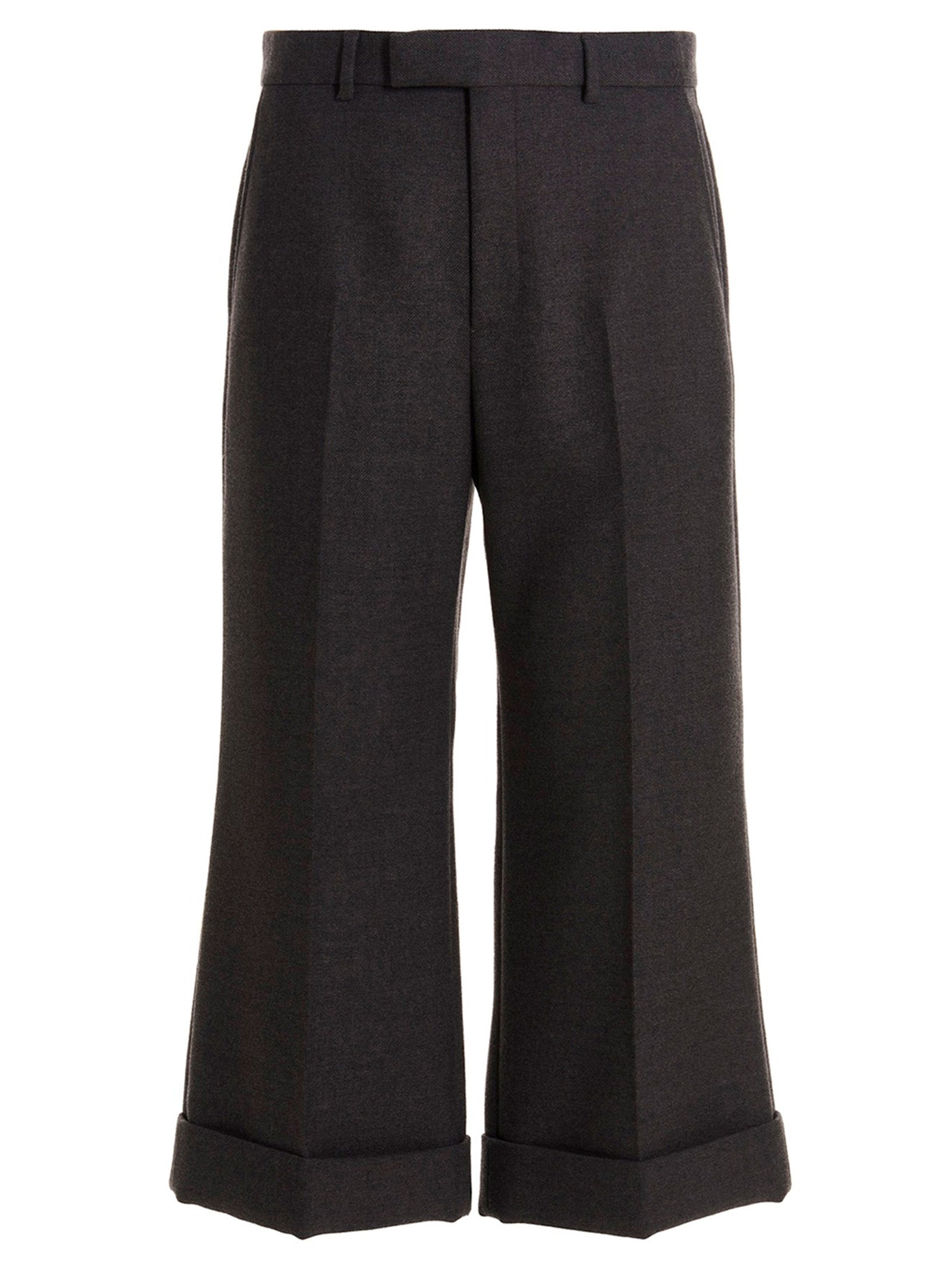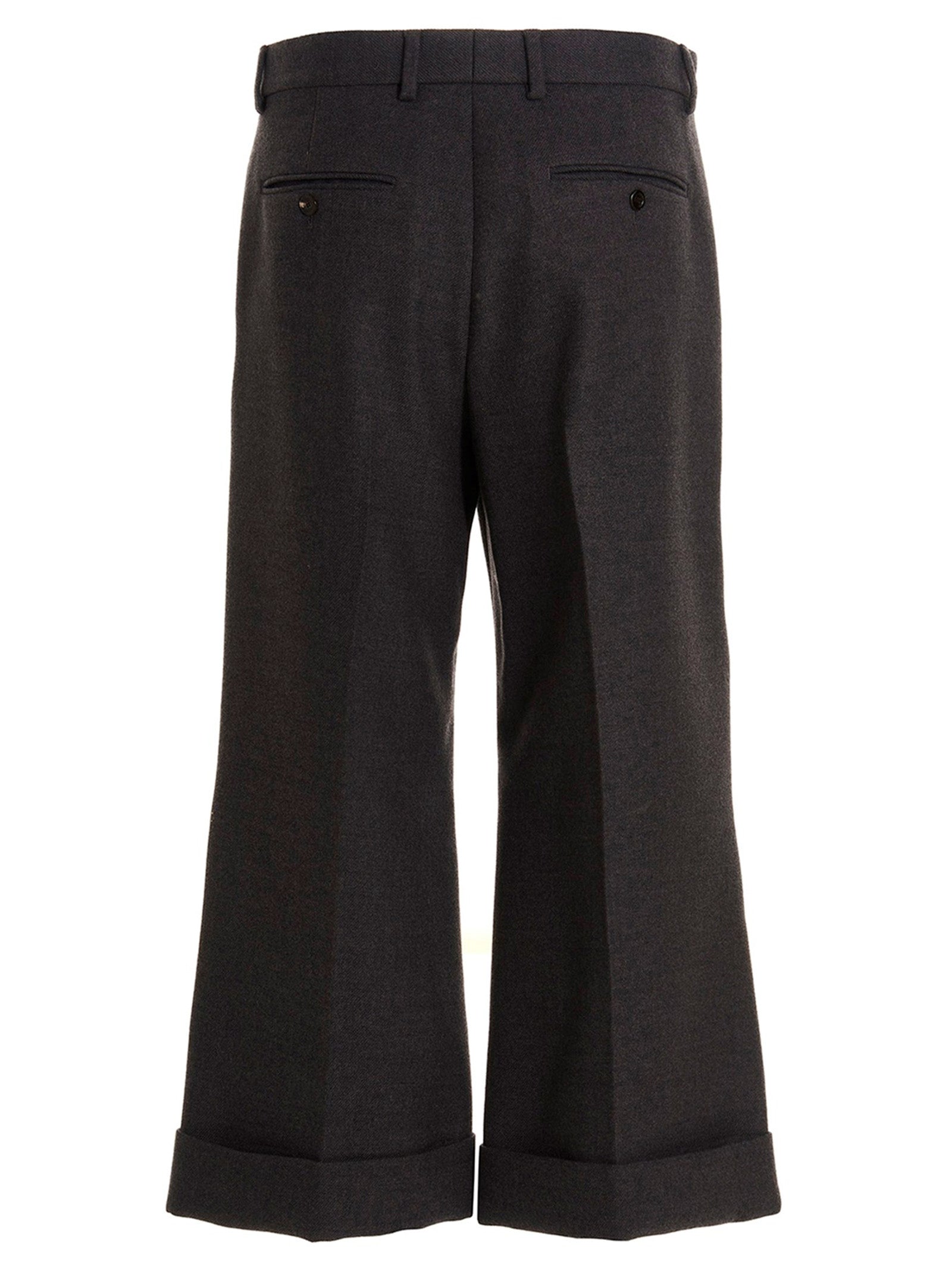 Elevate your workweek wardrobe with these sophisticated wool pants from Gucci. Crafted in a rich dark gray wool, these wide-leg trousers feature a flattering ankle length with distinctive turn-up hems that add a touch of sartorial elegance.