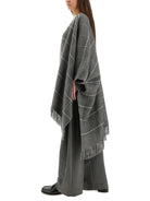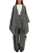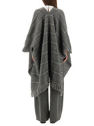 Elevate your layering game with this exquisite Wool Poncho with Fringe from Brunello Cucinelli. Crafted in Italy from a luxurious blend of 98% cashmere with subtle viscose and polyester accents, this poncho features a sophisticated gray windowpane check pattern that exudes timeless elegance.