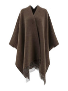 The draped silhouette and playful fringe detailing create effortless movement and dimension, making it the perfect transitional piece for any season. Whether draped over a crisp white tee and tailored trousers for the office or paired with your favorite denim for weekend outings, this versatile poncho adds instant polish to any ensemble.