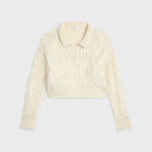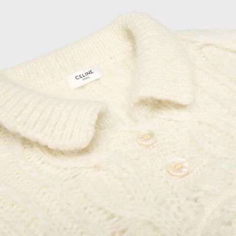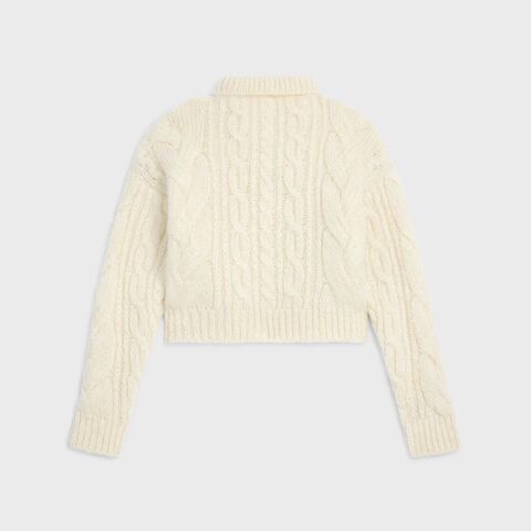 Elevate your knitwear collection with this luxurious wool sweater from Celine. Crafted in a beautiful cream tone, this cropped pullover features an intricate cable-knit pattern and a sophisticated collar detail that adds refined polish to any ensemble.