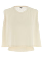 The innovative trapezoid silhouette showcases a unique double layer structure at the front, creating dimensional interest and contemporary appeal. Designed with a classic crew neckline and sleeveless cut, this crop sweater offers versatile styling options for the modern wardrobe.