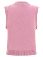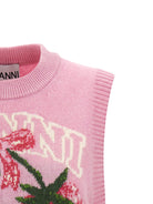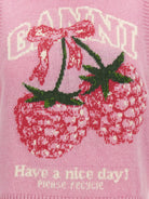 Add a playful touch to your wardrobe with this charming wool vest from Ganni. Crafted in a soft pink knit, this sleeveless pullover features an eye-catching sequined cherry graphic intarsia and whimsical text detailing that brings personality to any outfit.