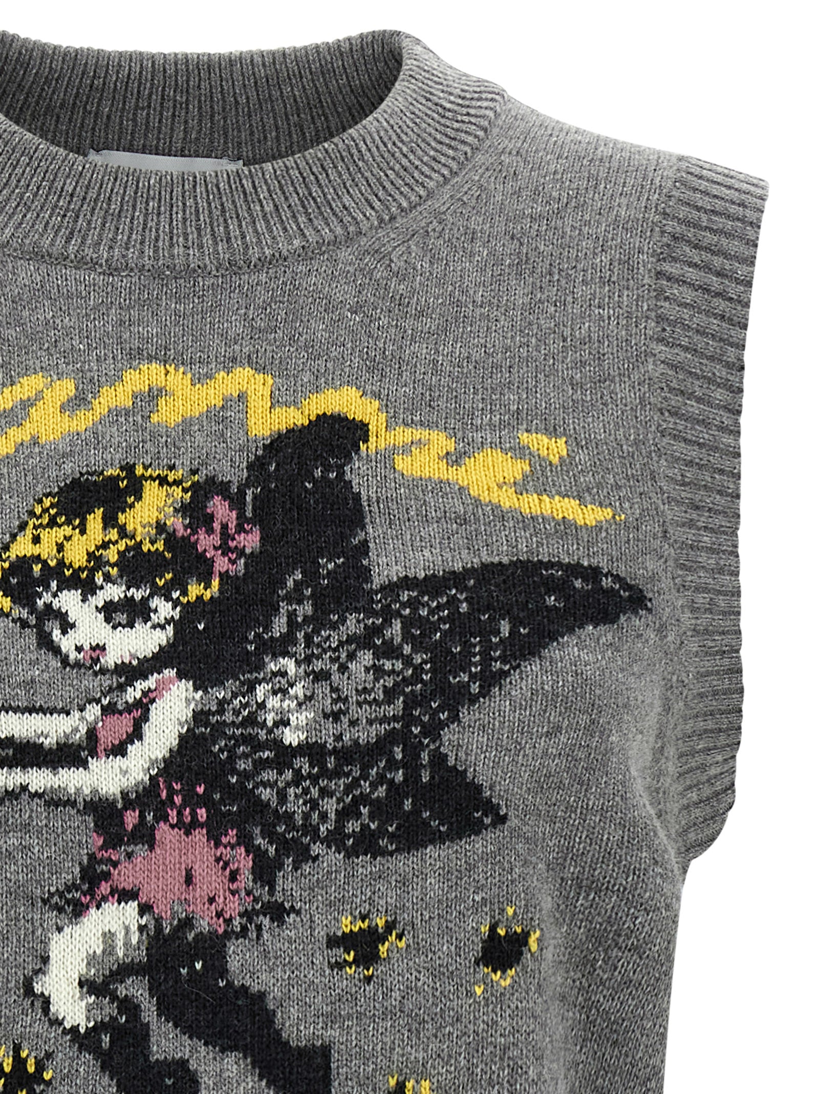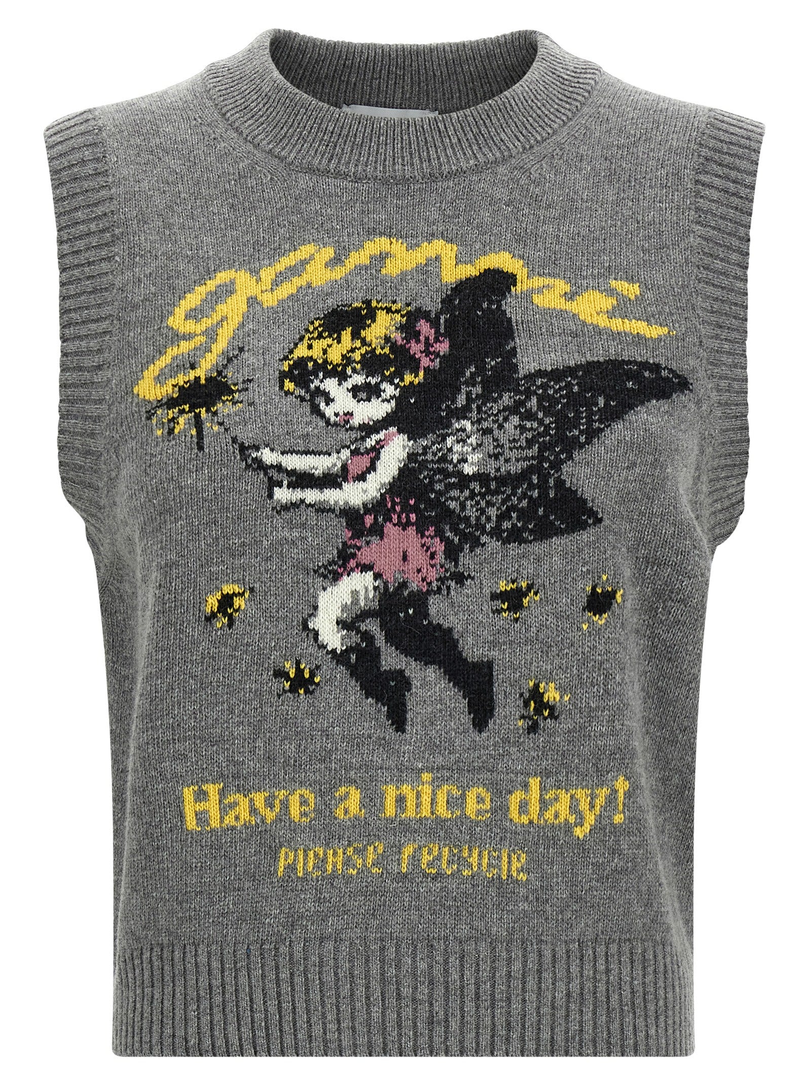 This charming wool vest from Ganni brings playful sophistication to your everyday wardrobe. Featuring an eye-catching front graphic intarsia with whimsical detailing and a classic crew neckline, this sleeveless pullover adds personality to any outfit.