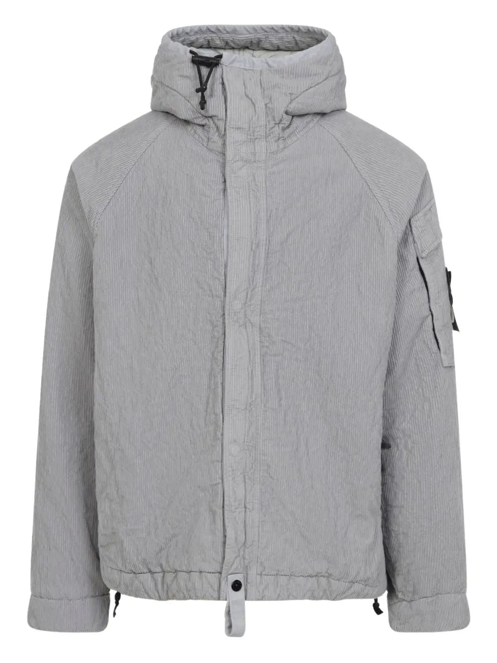 Elevate your outerwear collection with this Wrinkled Corduroy Jacket from Stone Island. Crafted from distinctive textured corduroy fabric in a versatile light gray tone, this jacket features a modern funnel neck collar, full zip closure, and signature utility pocket detail on the sleeve. The relaxed fit and adjustable drawstring hem make it perfect for layering during transitional seasons. Style it with casual denim and sneakers for an effortlessly cool off-duty look, or pair it with tailored trousers for elevated weekend wear. This piece combines Stone Island's renowned technical expertise with contemporary design for a jacket that's as functional as it is stylish.