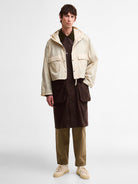 Introducing the Barbour x Kaptain Sunshine 2-in-1 Design Endurance Casual Jacket, a masterful collaboration that combines heritage craftsmanship with contemporary utility. This distinctive long parka features a striking two-tone colorblock design in cream and rich brown, crafted from 100% waxed cotton for superior weather protection and durability.