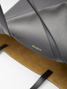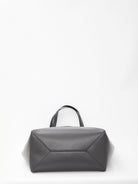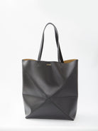 XL Puzzle Fold Tote bag in black shiny calfskin with embossed gold-tone Loewe logo on the front. Panels that allow the bag to change its shape and fold completely flat. It features fixed double handles and one wide single interior compartment. Suede lining. Dust bag included. Any leather imperfections are not to be considered manufacturing defects, but a peculiarity of the material.