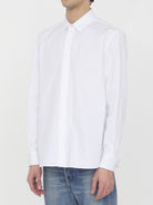 White cotton poplin shirt. It features Yves collar, front concealed button closure, single-button cuffs and curved asymmetric hem. Slim fit.