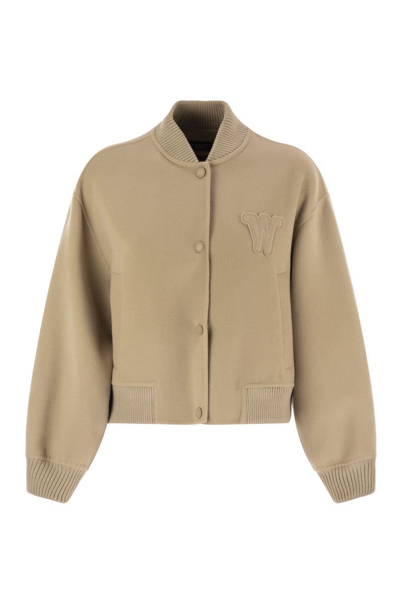 BOMBER JACKET IN DOUBLE WOOL BLEND FABRIC, WITH RIBBED KNITTED EDGE AND FELT PATCH ON THE CHEST. - SLIGHTLY OVER FIT - RIBBED KNIT COLLAR - LONG SLEEVES WITH DROPPED SHOULDER - FRONT CLOSURE WITH LOGOED SNAP BUTTONS - DIAGONAL WELT POCKETS ON THE FRONT - UNLINED DESIGNER ID: 2525086011600 063
