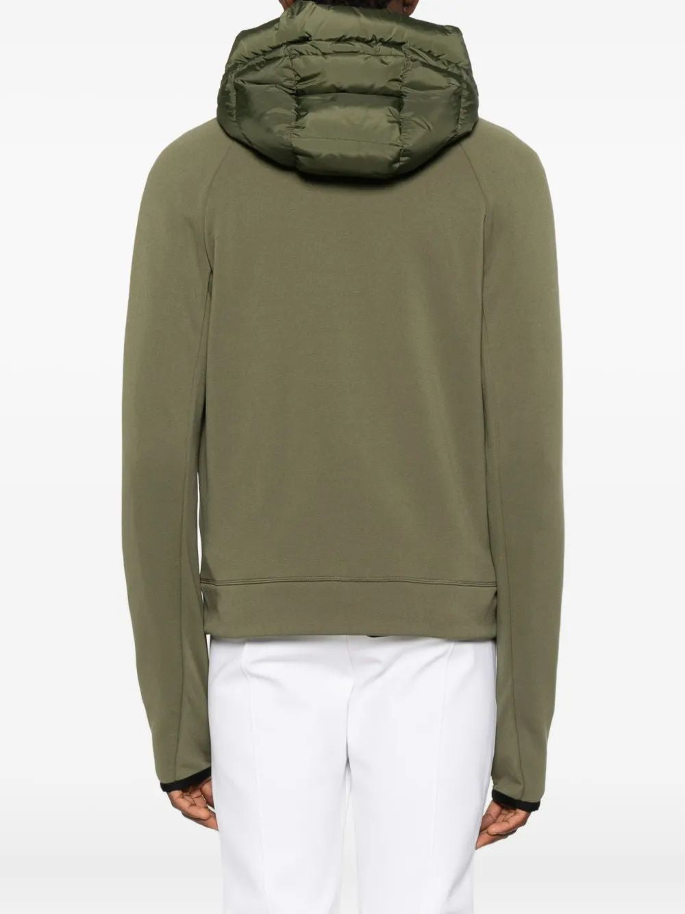 Elevate your athleisure wardrobe with this innovative zip cardigan from Moncler. Crafted in a sophisticated khaki tone, this piece features a unique dual-material construction with a quilted front panel and smooth fleece sleeves for the perfect blend of warmth and mobility. The straight fit silhouette offers a modern, relaxed aesthetic, while the full-zip closure and hood provide versatile styling options. Practical zipped side pockets and the signature embroidered logo add functional luxury to this essential layering piece. Perfect for transitional weather or post-workout comfort, this cardigan seamlessly bridges the gap between performance and style.