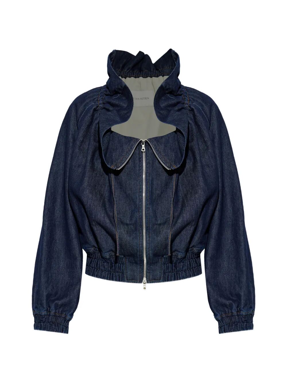 Elevate your outerwear collection with this stunning Zipped Denim Voly Jacket from Dries Van Noten. Crafted from 100% cotton denim in a rich navy hue, this bomber-style jacket features distinctive gathered detailing at the collar and voluminous sleeves that create a fashion-forward silhouette.