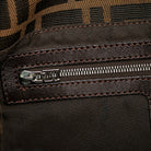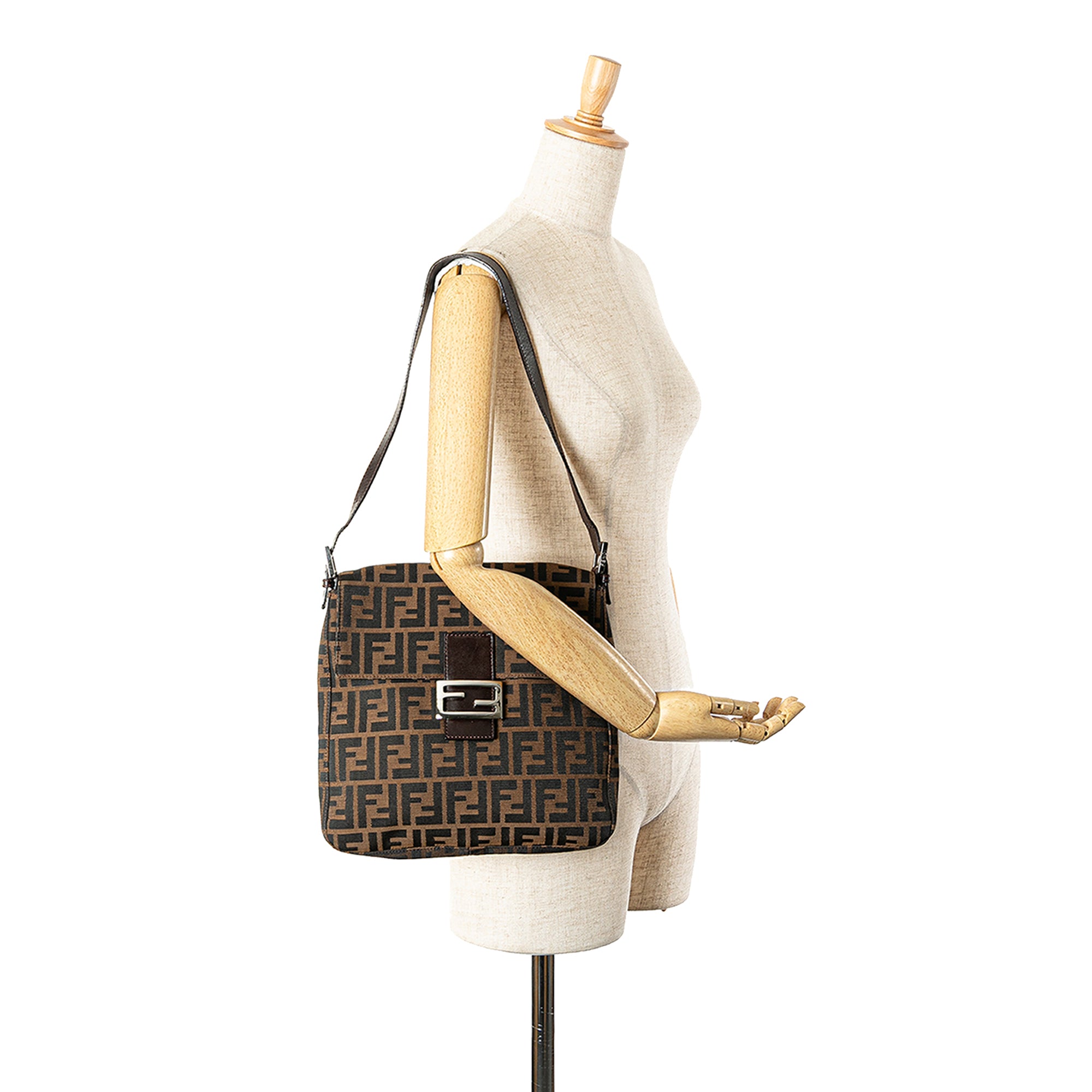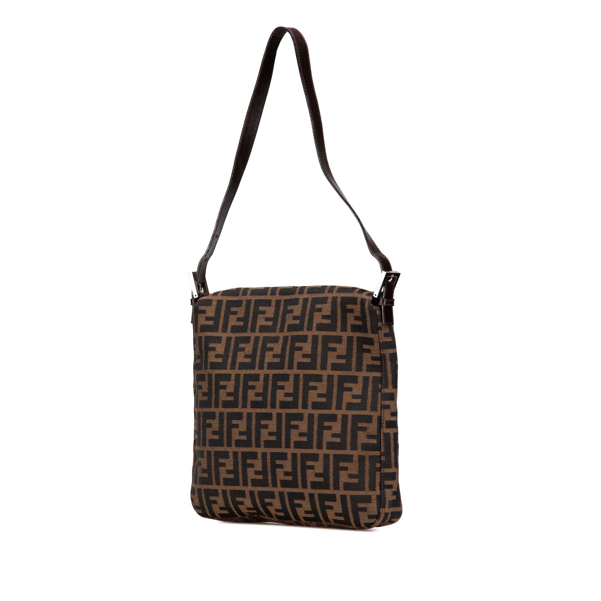 The practical design includes a front flap with magnetic snap closure for easy access, while an interior zip pocket keeps your essentials organized and secure. The classic brown Zucca pattern makes this shoulder bag a sophisticated addition to any wardrobe.
