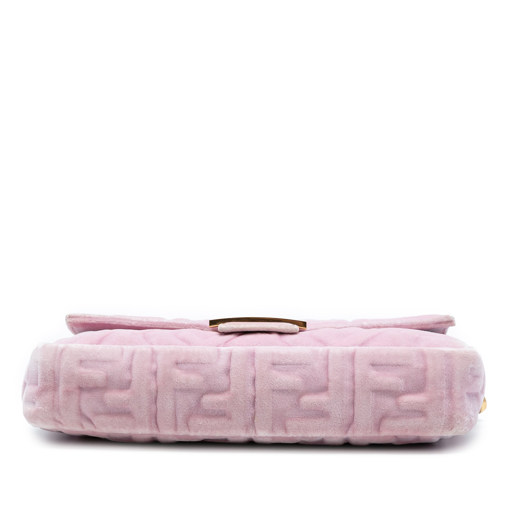 Elevate your accessory collection with this exquisite Fendi Zucca Embossed Velvet Baguette Satchel, a timeless icon of luxury craftsmanship. The sumptuous embossed velvet body showcases Fendi's signature Zucca pattern in a stunning pink hue, creating an elegant texture that catches the eye.
