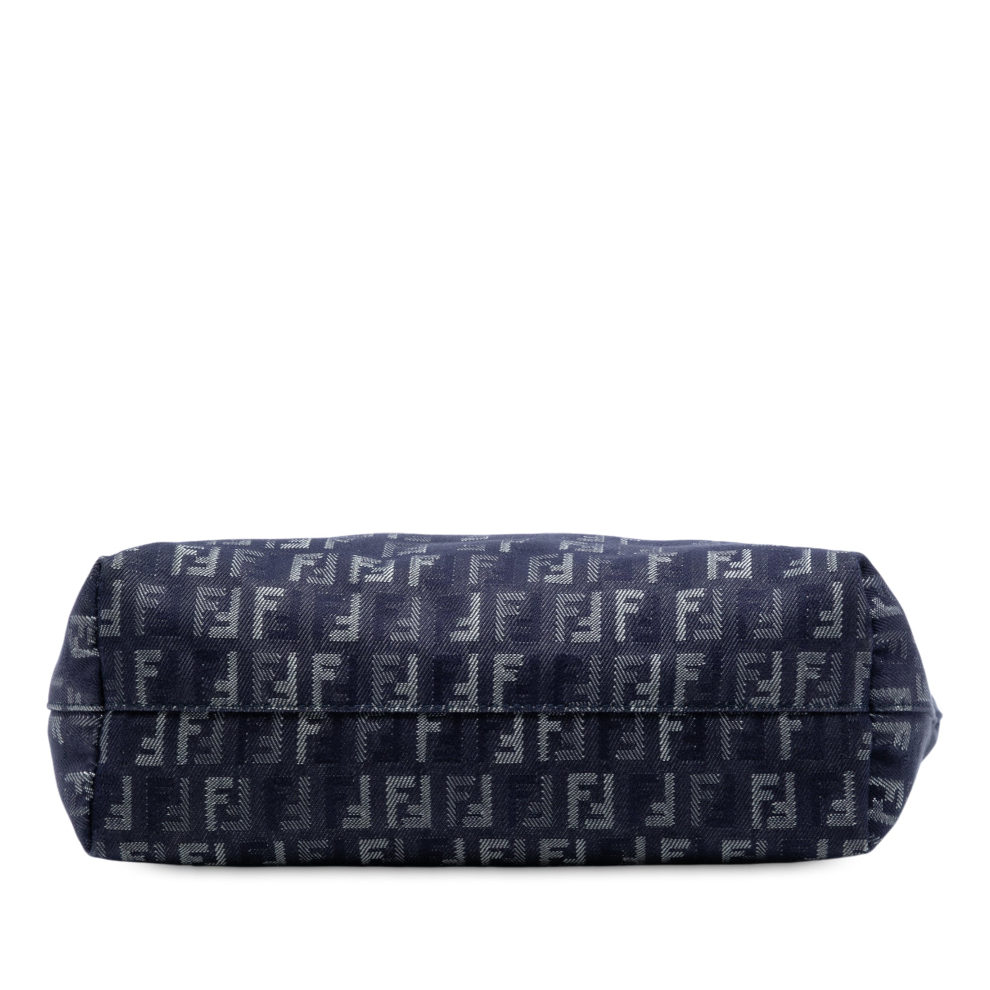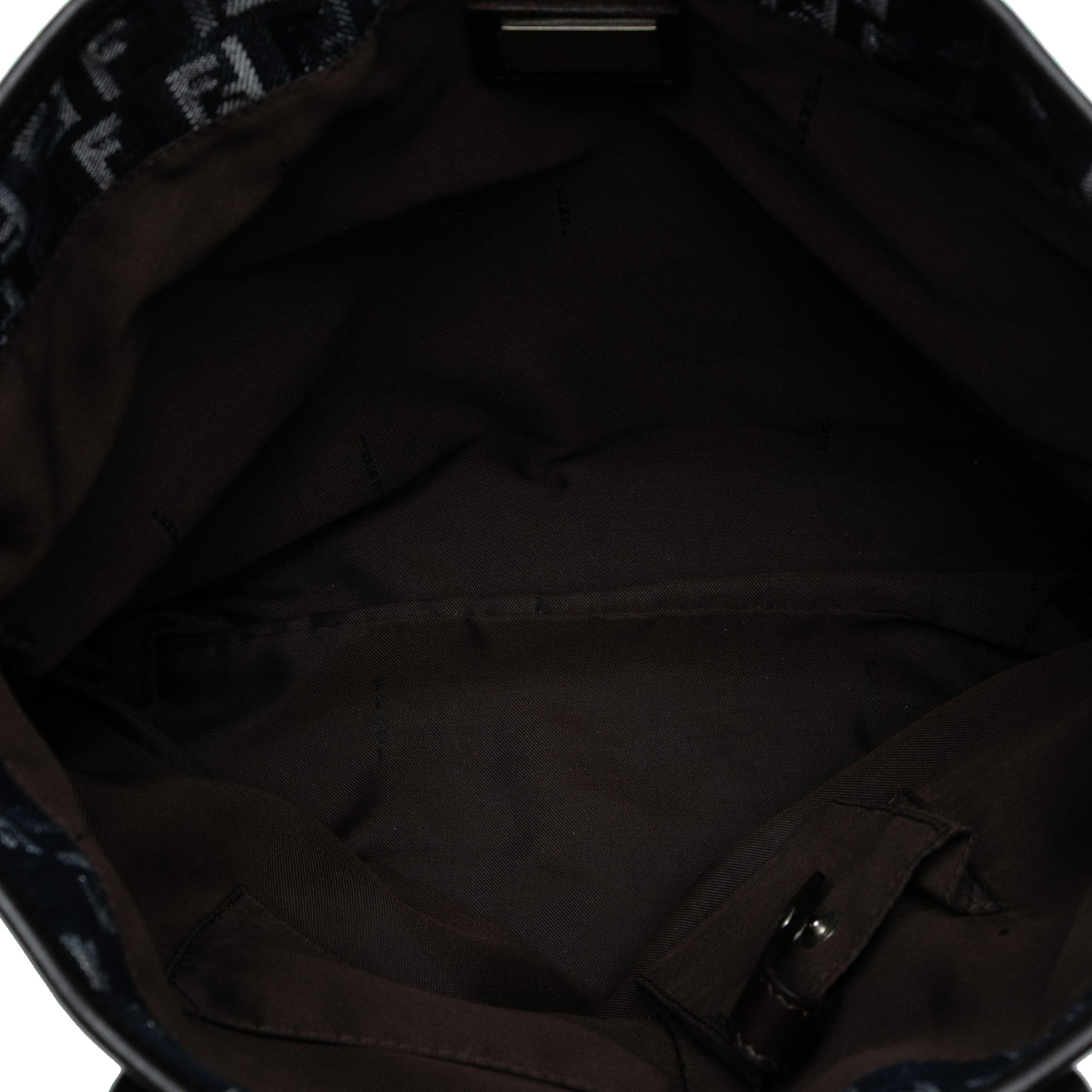 This tote bag features a denim body with leather trim, flat leather straps, an open top, and interior slip pockets.